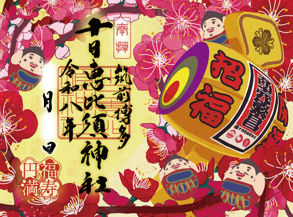 今回の見開き御朱印には、御祭神であるだいこく様の大きな福小槌を描き、色鮮やかな梅の花に福おこし達も大喜びしています。